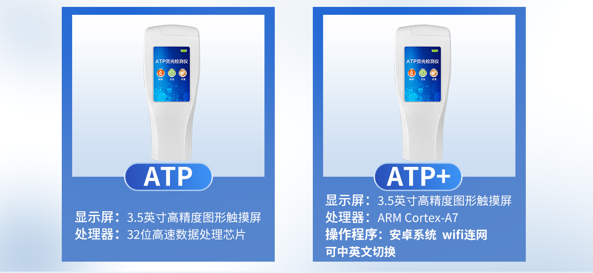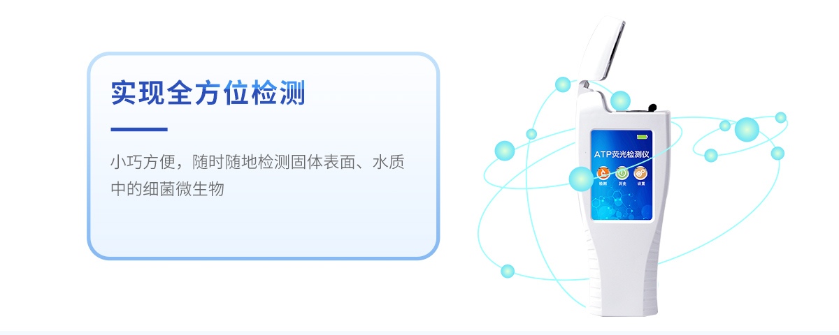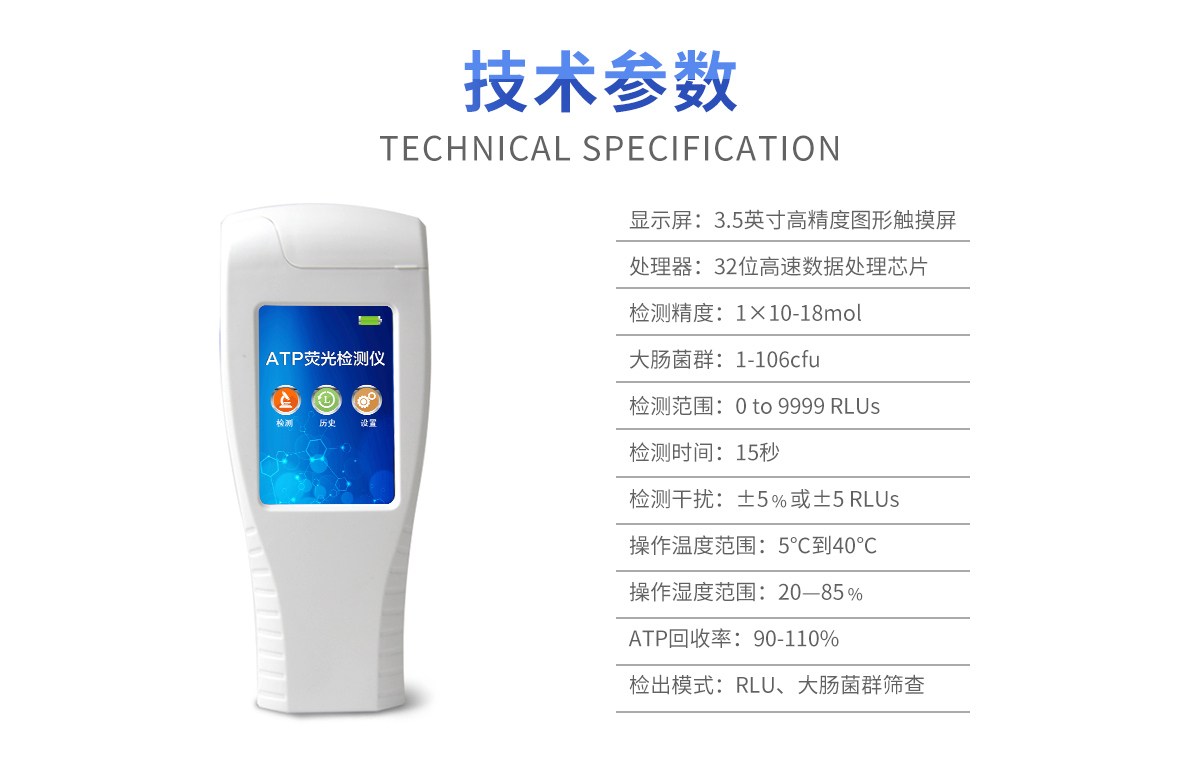 該設(shè)備為全新升級(jí)產(chǎn)品,大屏幕觸摸顯示屏,代替?zhèn)鹘y(tǒng)按鍵。操作采用生物化學(xué)反應(yīng)方法檢測(cè)ATP含量,ATP熒光檢測(cè)儀基于螢火蟲(chóng)發(fā)光原理,利用“熒光素酶—熒光素體系”快速檢測(cè)三磷酸腺苷(ATP)。ATP拭子含有可以裂解細(xì)胞膜的試劑,能將細(xì)胞內(nèi)ATP釋放出來(lái),與試劑中含有的特異性酶發(fā)生反應(yīng),產(chǎn)生光,再用熒光照度計(jì)檢測(cè)發(fā)光值,微生物的數(shù)量與發(fā)光值成正比,由于所有生物活細(xì)胞中含有恒量的ATP,所以ATP含量可以清晰地表明樣品中微生物與其他生物殘余的多少,用于判斷衛(wèi)生狀況。