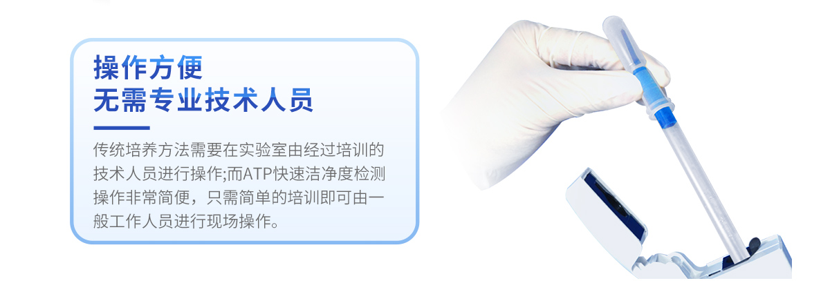 可操作性 —— 傳統(tǒng)培養(yǎng)方法需要在實(shí)驗(yàn)室由經(jīng)過(guò)培訓(xùn)的技術(shù)人員進(jìn)行操作;而ATP快速潔凈度檢測(cè)操作非常簡(jiǎn)便,只需簡(jiǎn)單的培訓(xùn)即可由一般工作人員進(jìn)行現(xiàn)場(chǎng)操作。