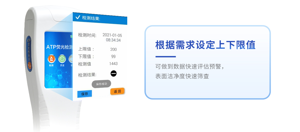 實(shí)用性 —— 可根據(jù)環(huán)境檢測(cè)需求設(shè)定上下限值,做到數(shù)據(jù)快速評(píng)估預(yù)警,表面潔凈度快速篩查。