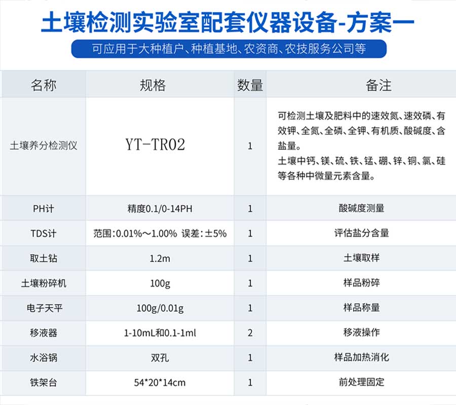 配套齊全:該儀器集藥、器、儀為一體,攜帶方便,相當(dāng)于一個小型移動實驗室,無需用戶自配附件,亦可靈活野外流動測試。適于農(nóng)業(yè)服務(wù)部門或農(nóng)資經(jīng)銷商、高教院校、科研院所、合作社、肥料廠商、大種植戶測土施肥和鑒別肥料真假及環(huán)保檢測應(yīng)用。