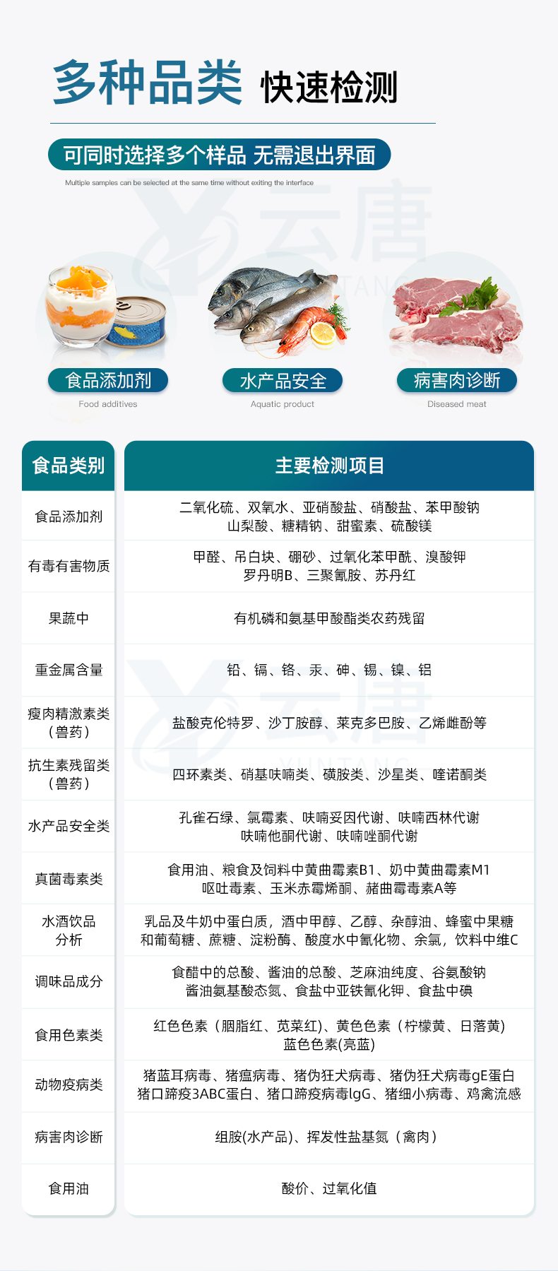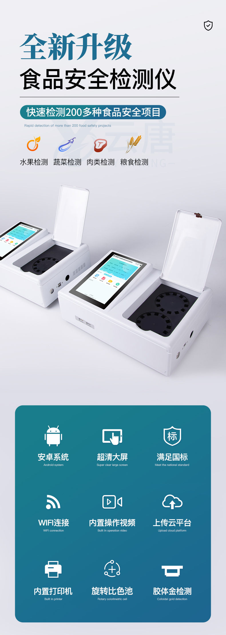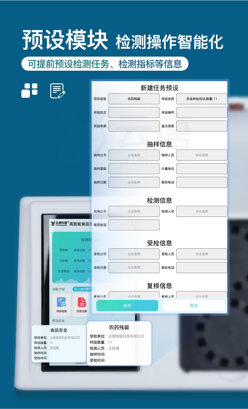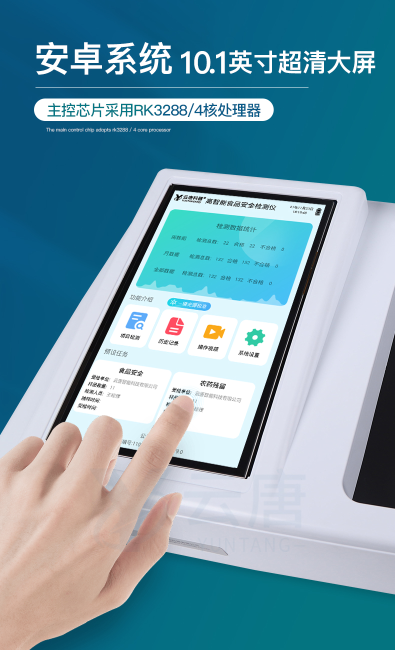 山東云唐智能科技有限公司生產(chǎn)的高智能食品安全檢測(cè)儀為集成化食品安全快速檢測(cè)分析設(shè)備,采用臺(tái)式一體化設(shè)計(jì),可快速檢測(cè)200多種食品安全項(xiàng)目,包含非食用化學(xué)物質(zhì)、濫用食品添加劑、農(nóng)藥殘留、獸藥殘留、重金屬、病害肉、營(yíng)養(yǎng)強(qiáng)化劑、抗生素類(lèi)殘留、激素類(lèi)殘留、真菌毒素類(lèi)殘留、化學(xué)類(lèi)殘留等項(xiàng)目的定性定量檢測(cè)。