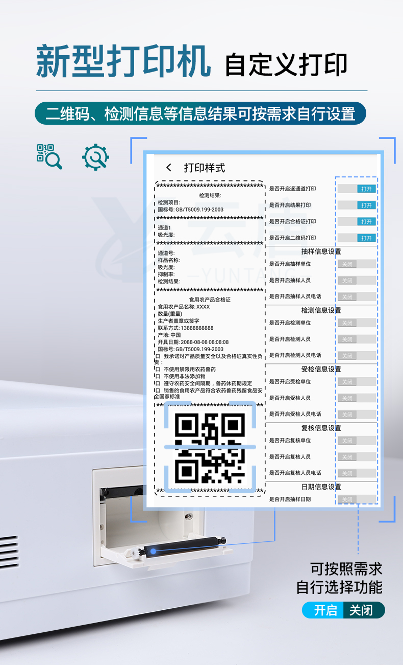 ★自定義打印系統(tǒng):內(nèi)置熱敏打印機(jī);系統(tǒng)打印格式多樣化,產(chǎn)品合格證(國(guó)家農(nóng)業(yè)部標(biāo)準(zhǔn)要求),二維碼,抽樣信息、檢測(cè)信息,受檢信息、復(fù)核信息、抽樣日期、檢測(cè)日期等信息結(jié)果,可按實(shí)際需求自行設(shè)置開(kāi)啟或關(guān)閉,完成打印。(需提供對(duì)應(yīng)證明)