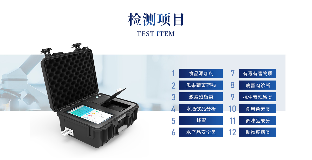 山東云唐智能科技有限公司生產(chǎn)的高智能食品安全檢測(cè)儀可快速檢測(cè)200多種食品安全項(xiàng)目,包含非食用化學(xué)物質(zhì)、濫用食品添加劑、農(nóng)藥殘留、獸藥殘留、重金屬、病害肉、營(yíng)養(yǎng)強(qiáng)化劑、抗生素類殘留、激素類殘留、真菌毒素類殘留、化學(xué)類殘留等項(xiàng)目的定性定量檢測(cè)。